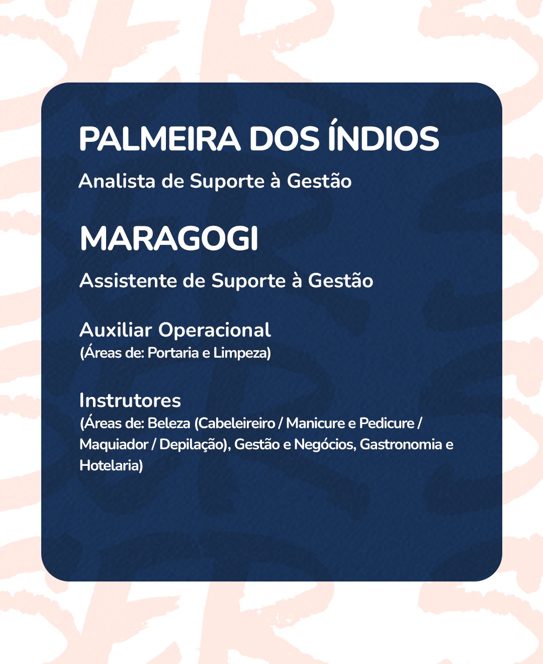 O Senac Alagoas é uma instituição de educação profissional que atua para proporcionar a transformação de vidas e de realidades. Se você é apaixonado por educação e acredita nessa missão, participe do processo seletivo para ser um colaborador Senac!Ao todo, são 39 vagas distribuídas para Arapiraca, Delmiro Gouveia, Maceió, Maragogi e Palmeira dos Índios, podendo contratar ainda mais pessoas de acordo com a demanda e a validade do processo seletivo. Os interessados devem ler os comunicados publicados no site https://al.senac.br/processos-seletivos e cadastrar o currículo no link indicado, a partir do dia 26 de fevereiro, conforme comunicado publicado.