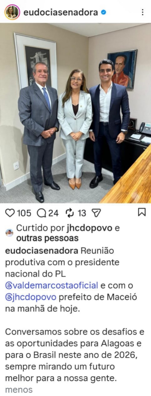 A foto publicada pela senadora Dra. Eudócia - ao lado do prefeito de Maceió JHC e do presidente nacional do PL, Valdemar Costa Neto - foi descrita como “reunião produtiva” e tratou de “desafios e oportunidades” para 2026.