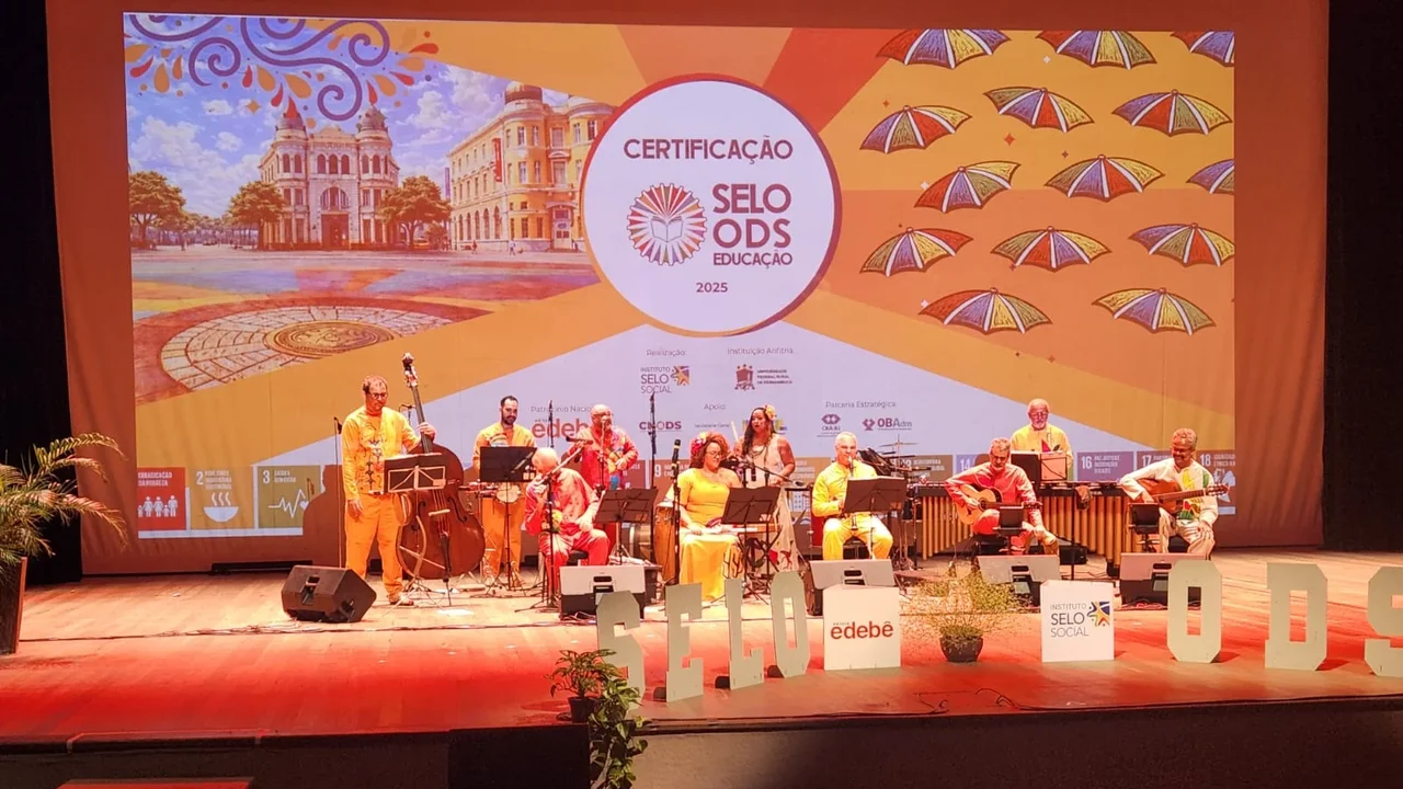 A Cerimônia Nacional de Certificação do Selo ODS Educação 2025 começou com a apresentação do Grupo Sagrama, que colocou no repertório uma música do Guerreiro alagoano. Em seguida, foi formada a frente de honra com a participação da reitora da UFRPE, Ana Maria de Sena, do presidente do Instituto Selo Social, de Fernando Assanti, do secretário-executivo da Comissão Nacional para os ODS, da Secretaria-Geral da Presidência da República, Lavito Bacarissa, e o gerente de negócios Vitor Silva, da Editora Edebê, parceira do Selo.