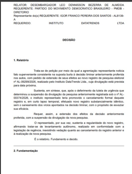 Em uma delas, o desembargador eleitoral Antonio José de Carvalho Araújo determinou a proibição definitiva da pesquisa nº AL-03400/2026, do Instituto Verita Ltda., com aplicação de multa de R$ 53.205,00. A ação foi movida pelo MDB em Alagoas.