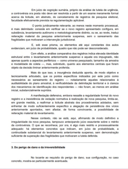 Na decisão, o magistrado apontou indícios de que o novo levantamento seria, na prática, uma reedição de pesquisa anteriormente suspensa, sem correção das falhas técnicas já identificadas. Entre os problemas citados estão inconsistências no plano amostral, fragilidades na delimitação territorial e ausência de mecanismos claros de verificação dos entrevistados.