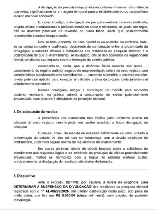 Já o desembargador Maurício César Breda Filho suspendeu a pesquisa nº AL-05611/2026, da empresa Falpe Pesquisas. O levantamento foi realizado apenas na Região Metropolitana de Maceió, apesar de tratar de cargos estaduais, o que excluiu grande parte do eleitorado do interior.