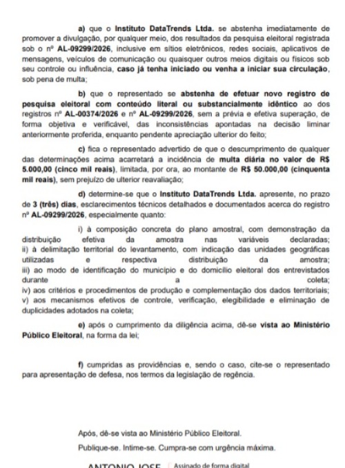 A Justiça Eleitoral de Alagoas voltou a barrar a divulgação de pesquisa eleitoral por irregularidades e reforçou o rigor sobre levantamentos no estado. Em decisão assinada pelo magistrado Sanderson Ferreira da Paz, nesse sábado (25), foi determinada a suspensão da pesquisa registrada sob o nº AL-09299/2026, do Instituto DataTrends.