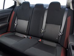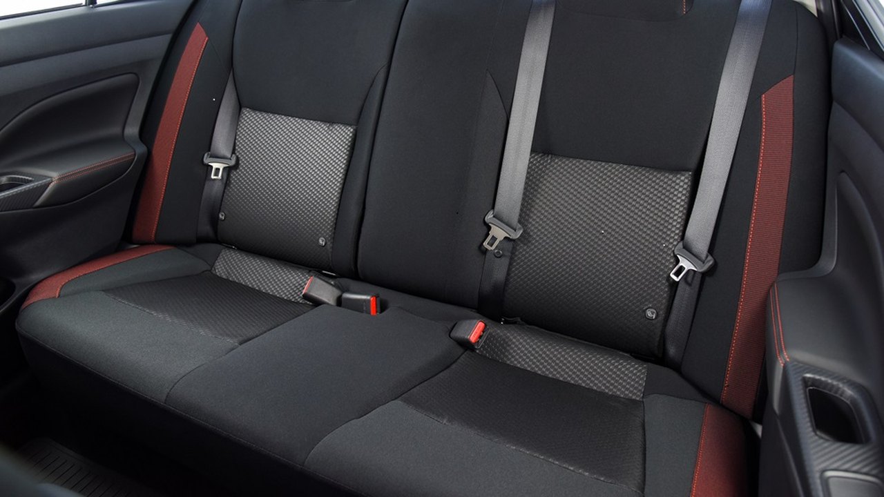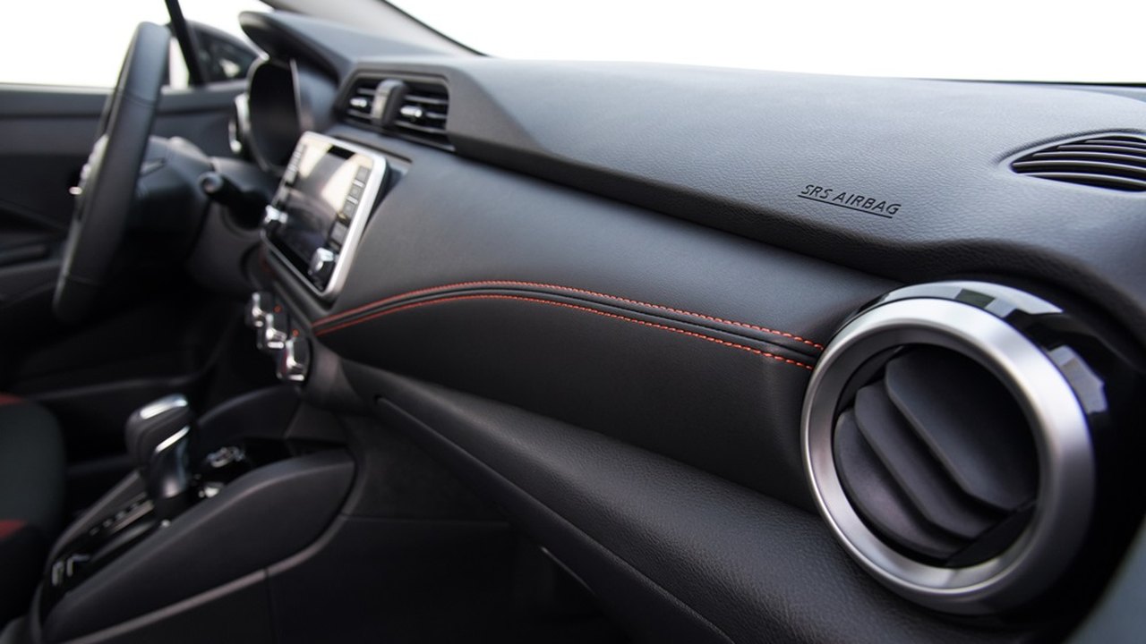Por dentro o Nissan Versa SR é identificado pela costura dupla em laranja. O painel conta com acabamento em black piano e o volante com material sintético premium. Alumínio é usado no console central, volante, painel frontal e portas, que ainda têm cromados nas maçanetas internas. Além disso, há detalhes com aparência de fibra de carbono nas portas e no painel de instrumentos.