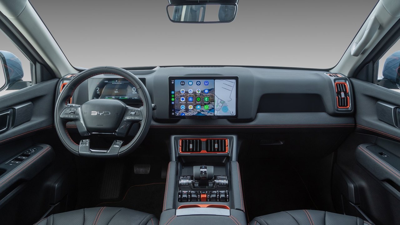 Um dos destaques da Shark é a tecnologia DMO, desenvolvida pela BYD para veículos híbridos plug-in, que possibilita à picape alternar entre diferentes modos de condução.