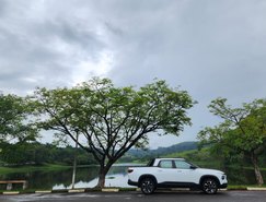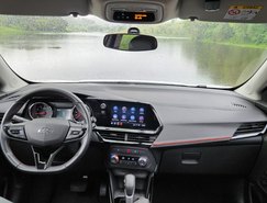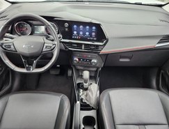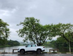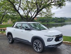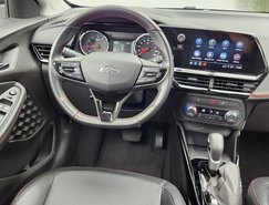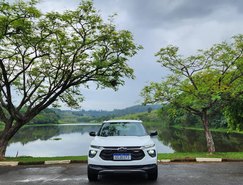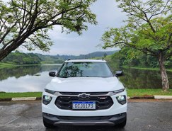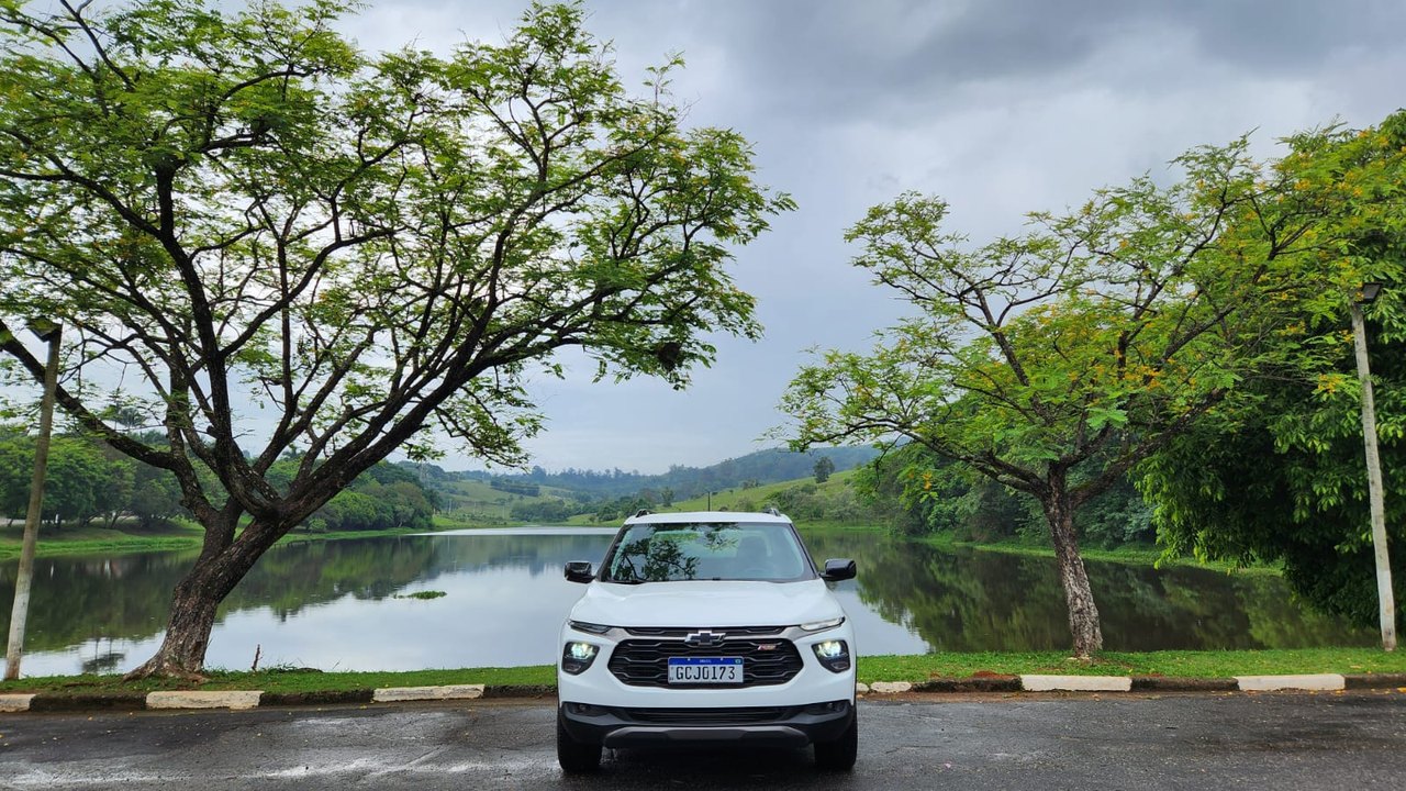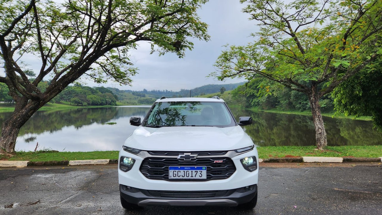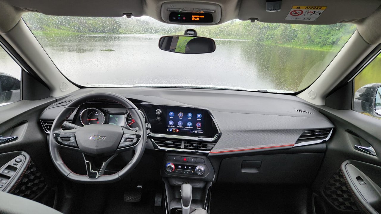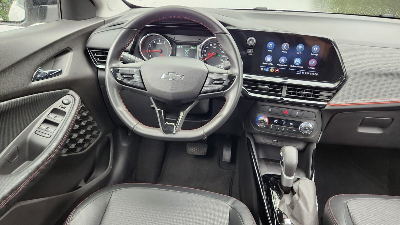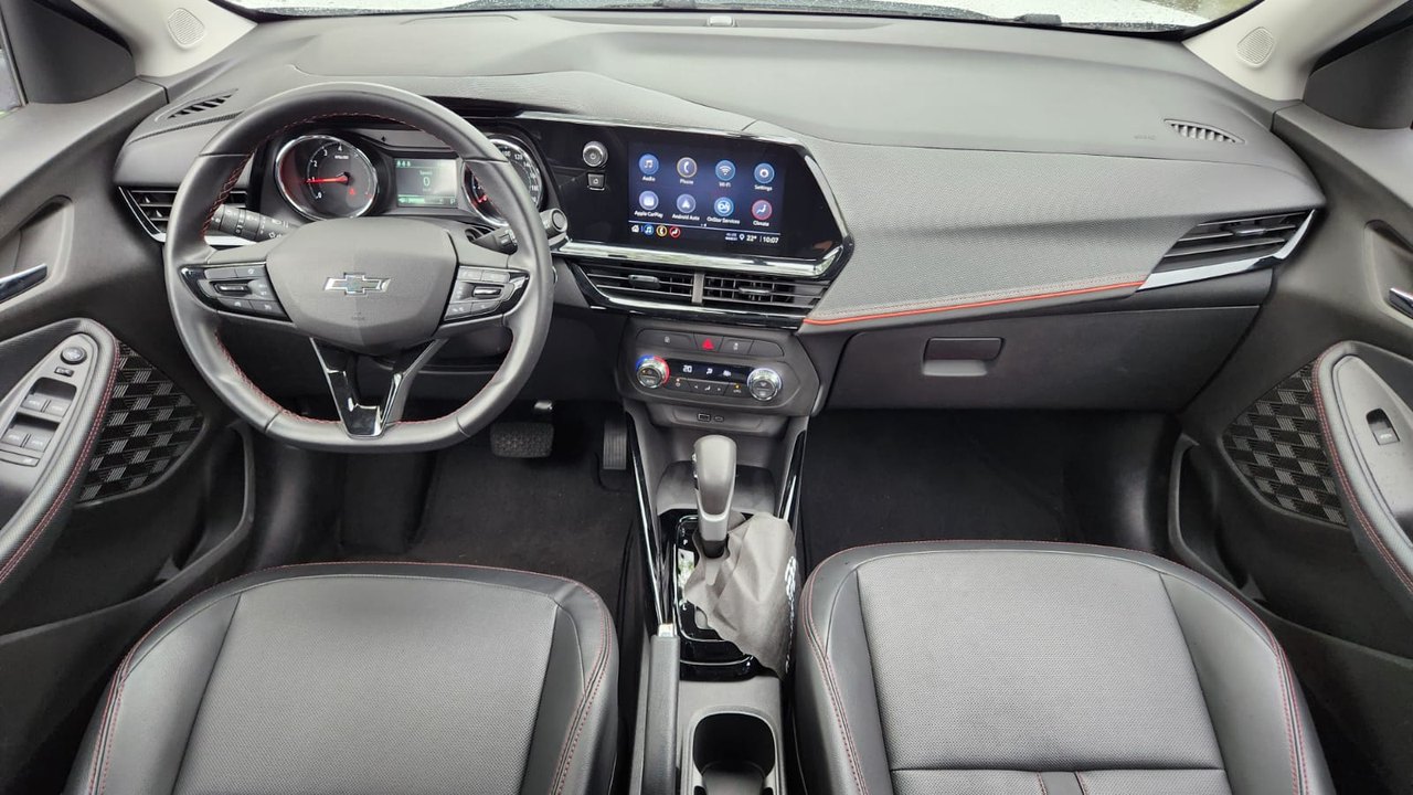 A versão avaliada RS apresenta uma proposta mais esportiva. O design se destaca pelo logotipo Chevrolet em preto, rodas escurecidas e diamantadas de 17 polegadas, além de detalhes em Black Piano nos retrovisores, rack de teto e acabamento interno. Os bancos com costuras em vermelho reforçam o visual diferenciado da versão.