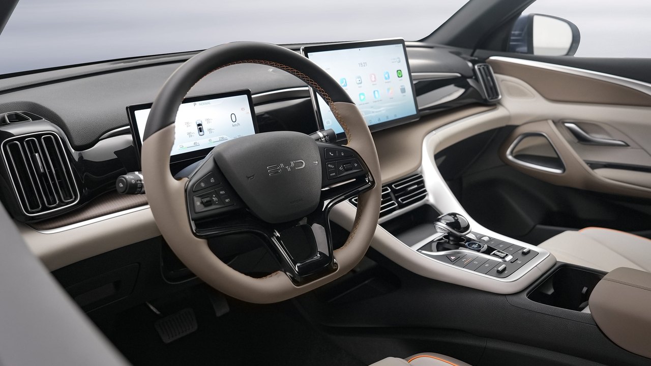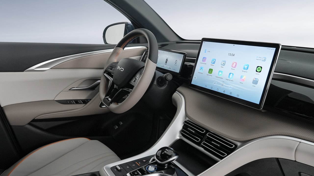 No interior, o Song Pro DM-i traz um acabamento de qualidade com um design bicolor de baixo contraste, projetado para criar uma atmosfera elegante e confortável. Um dos destaques é a tela giratória de 12,8 polegadas, que pode ser ajustada para exibir diferentes informações, facilitando o acesso a navegação e controles do veículo. O painel de instrumentos LCD Full-View de 8,8 polegadas e o sistema de Cockpit Inteligente da BYD, com comandos de voz e atualizações Over-The-Air, garantem um alto nível de conectividade e interação.