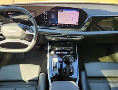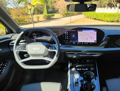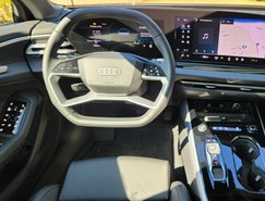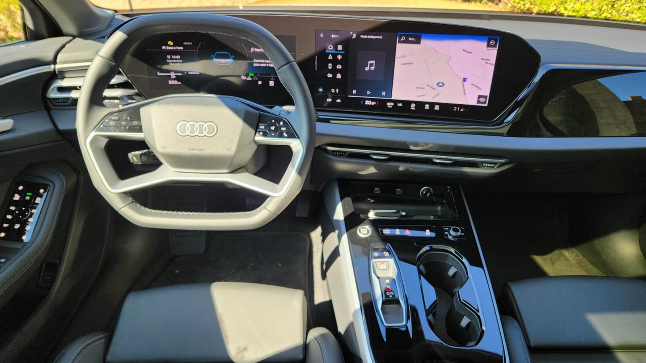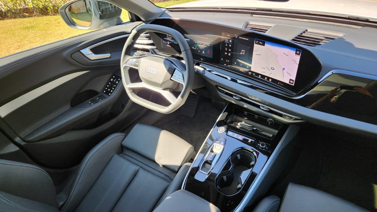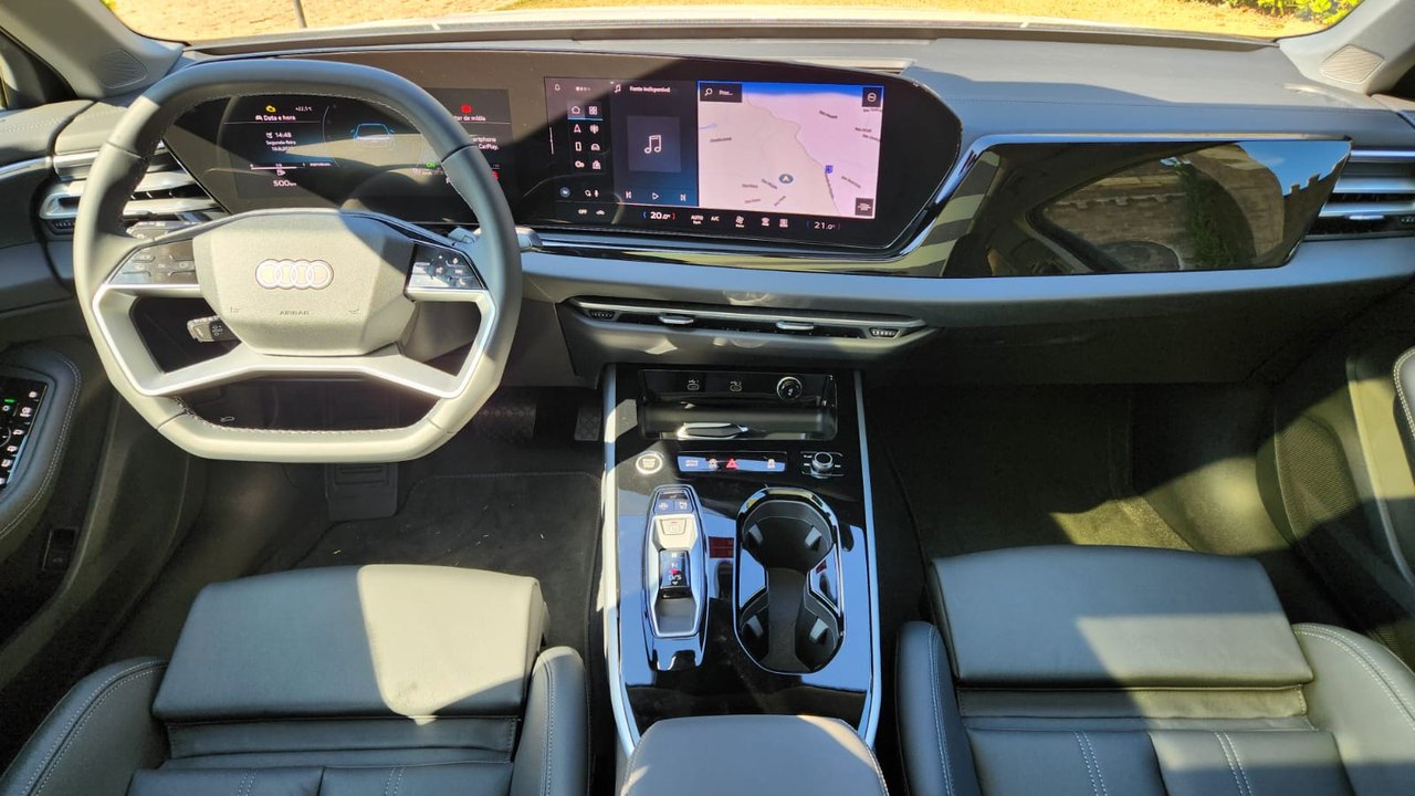 O interior segue o conceito da Audi centrado no condutor. O painel combina o Audi Virtual Cockpit de 11,9 polegadas com o display panorâmico curvo de 14,5 polegadas, equipado com tecnologia OLED. A operação dos comandos foi atualizada, enquanto o sistema de luz ambiente permite 30 opções configuráveis. O ar-condicionado automático de três zonas e os bancos dianteiros com ajustes elétricos e memória para o motorista complementam a cabine.