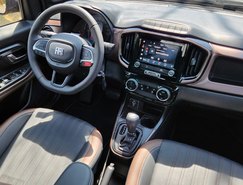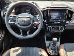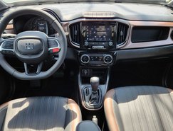 No topo estão as versões Ranch e Ultra, ambas com o motor Turbo 200 Flex. A Ranch, que avaliei, combina diferenciais visuais, como grade dianteira redesenhada e novos faróis de neblina em LED, além de bancos em couro e novos painéis de porta. Já a Ultra se destaca por uma proposta mais esportiva, com detalhes exclusivos como friso vermelho na grade e nome da versão bordado nos bancos.