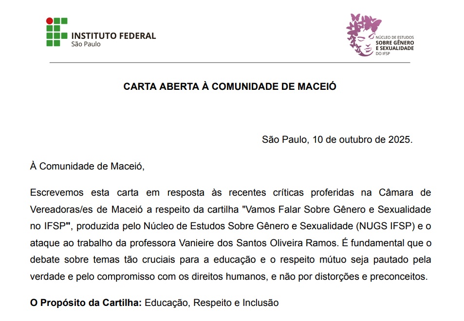 Na última sexta-feira, 10, o Núcleo de Estudos sobre Gênero e Sexualidade do IFSP (NUGS), publicou uma carta aberta em resposta às falas de vereadores de Maceió sobre a cartilha.