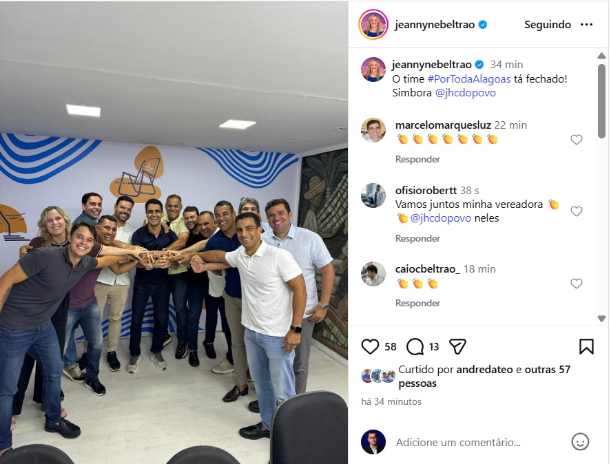"O time #PorTodaAlagoas tá fechado! Simbora @jhcdopovo", reforçou Jeannyne Beltrão.