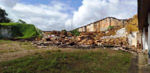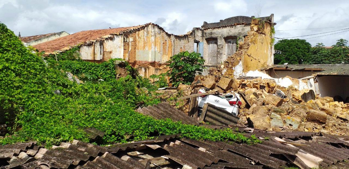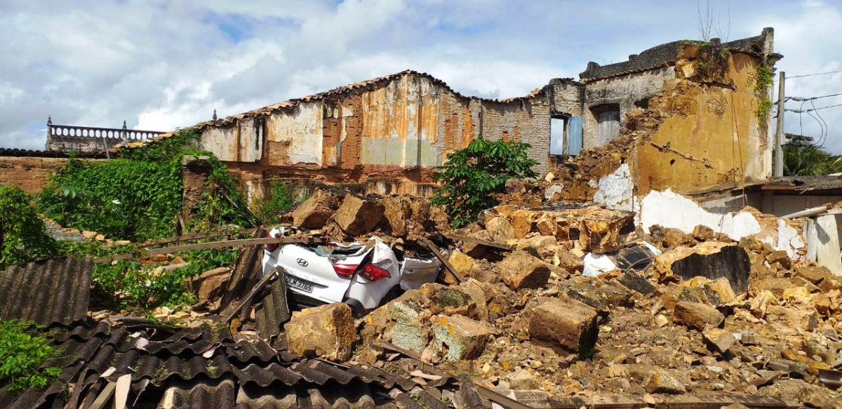 Durante o final de semana de muita chuva em Penedo, parte da estrutura do casarão arriou sobre o muro, caindo sobre dois veículos guardados no estacionamento.