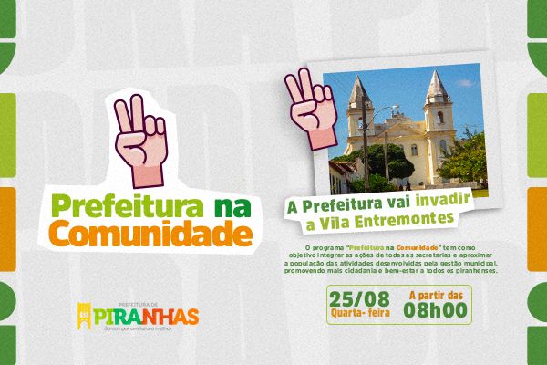 Aproximar a gestão pública das comunidades e conhecer de perto os desafios dos moradores de cada região. Esse é um dos objetivos do prefeito Tiago Freitas e sua gestão com a implantação do Programa “Prefeitura na Comunidade”, que será lançado nesta quarta-feira, 25 de agosto, na Vila Entremontes, em Piranhas.