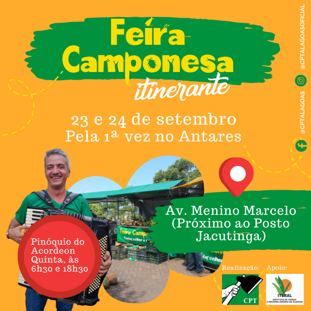 Realizada pela Comissão Pastoral da Terra (CPT), com apoio do Instituto de Terras e Reforma Agrária de Alagoas (Iteral), a feira contará com ao menos dez bancas cheias de alimentos produzidos por famílias camponesas de comunidades de assentamentos e acampamentos da luta pela reforma agrária no litoral, na zona da mata e no sertão alagoano. Entre os produtos disponíveis haverá banana, laranja, macaxeira, cará, abóbora, animais, mel, goma, pé de moleque e tapioca.