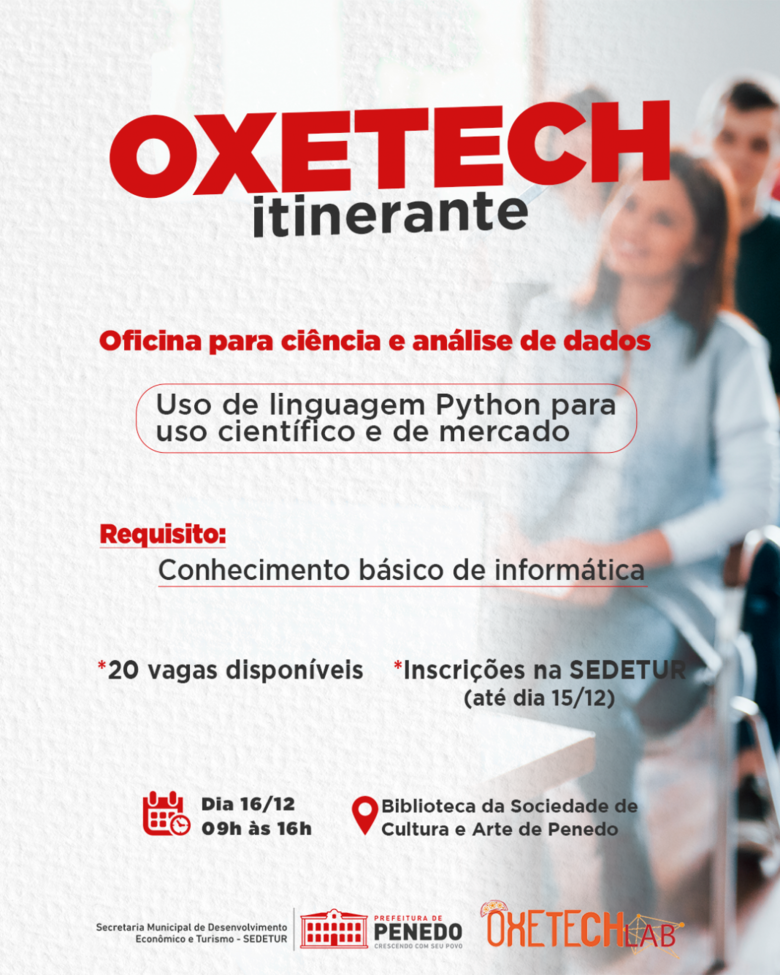 Para capacitar a população com o uso de linguagem Python para uso científico e de mercado na ciência e análise de dados, a Secretaria Municipal de Desenvolvimento Econômico e Turismo (Sedetur) em parceria com o OxeTech ofertam uma oficina na próxima quinta-feira (16).