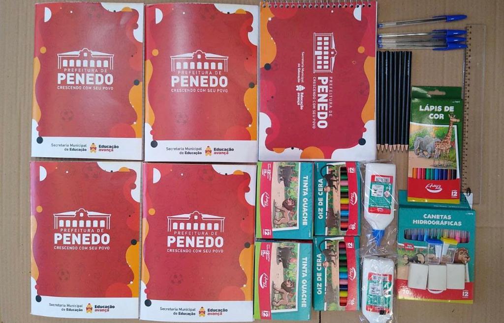Para estudantes do Ensino Fundamental, destaque para os cadernos personalizados com arte que identifica o material entregue pela Prefeitura de Penedo e os outros itens do kit, tudo em quantidade suficiente para o ano letivo.