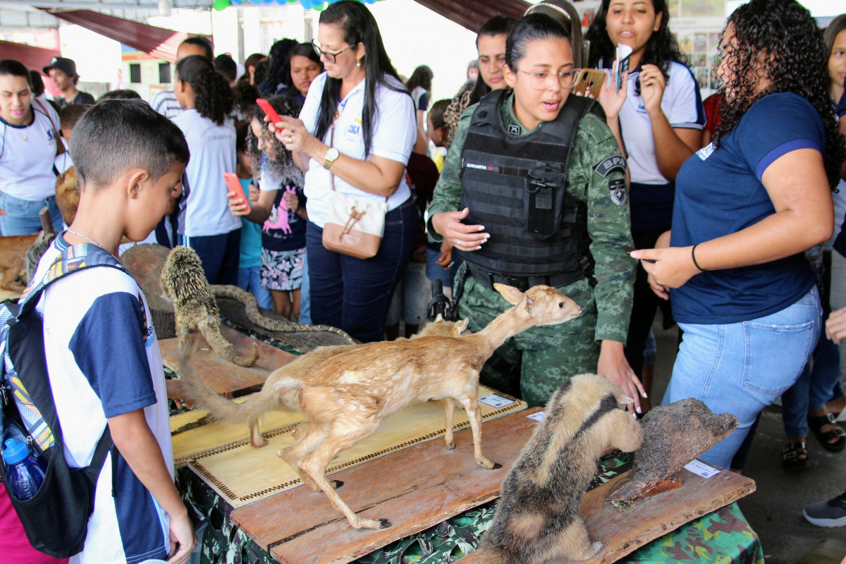 “É uma satisfação prestigiar uma feira tão rica em conhecimento, tenho certeza que essa ação traz um ganho muito grande à comunidade. Nós apresentamos uma exposição de animais taxidermizados, que são utilizados para exibição ou estudo. Essa é uma técnica de preservação da forma da pele, planos e tamanho dos animais, que é realizada já depois que recebemos o animal morto por alguma causa clínica. Rodamos o estado inteiro com essa exposição, explicando pontos importantes sobre a preservação ambiental e tirando dúvidas principalmente das crianças em relação aos animais expostos”, pontuou o sargento.