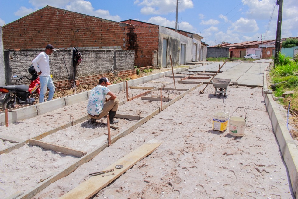 Em ritmo acelerado, ruas desprovidas de pavimentação ganham o investimento que também instala meio-fio e calçada, proporcionando mais conforto, segurança e direcionamento das chuvas para a rede de drenagem.