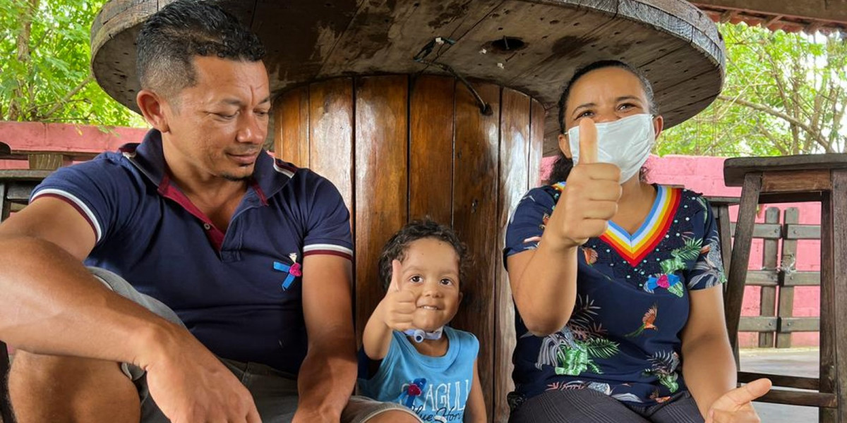 O pequeno Firmino, entre os pais, faz sinal de positivo: ele se recupera bem. Foto: Atylla Bezerra