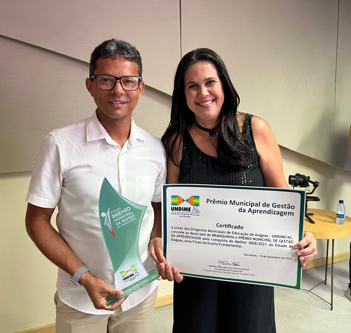 O ensino municipal de Branquinha alcançou posições inéditas no ranking estadual do Índice de Desenvolvimento da Educação Básica (Ideb), referentes ao ano de 2021, onde conquistou o 3º lugar entre os municípios da zona da mata e o 6º lugar no estado; e em razão disso, na noite desta quarta-feira (14) em Maceió, o secretário de educação, Ednaldo Firmino e a primeira-dama, Renata Freitas (representando o prefeito Neno Freitas), receberam o Prêmio de Gestão da Aprendizagem promovido pela União Nacional dos Dirigentes Municipais de Educação (Undime).