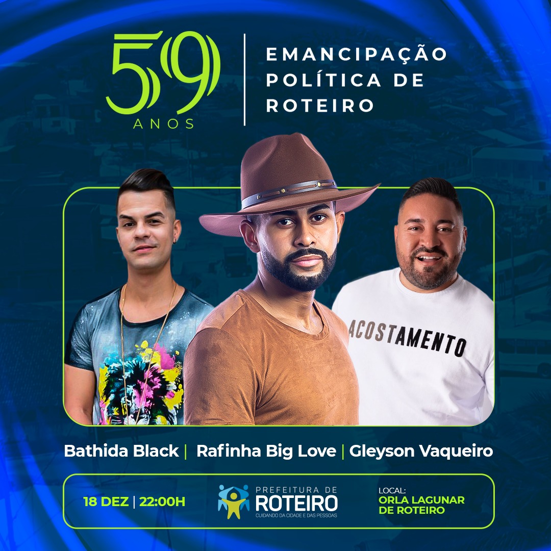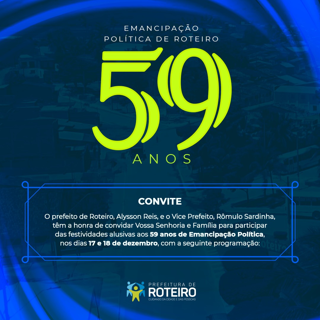 “Vamos comemorar e festejar esta data ao lado de todos os roteirenses. São 59 anos de desenvolvimento, muito trabalho e dedicação ao povo desta terra. Só tenho a agradecer a todos que contribuíram e contribuem com o crescimento e avanço para que tenhamos dias melhores em nosso município. Nosso compromisso é pelo bem de todos os cidadãos de Roteiro!”, enfatizou o prefeito Alysson Reis.