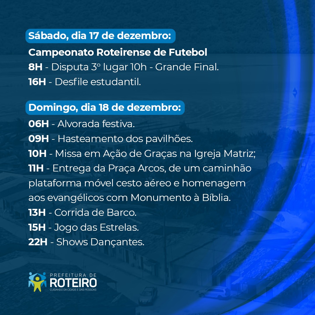 No sábado,17, pela manhã, haverá o Campeonato Roteirense de Futebol. O desfile estudantil será a partir das 16hrs. No domingo, 18, pela manhã, a alvorada festiva, hasteamento dos pavilhões, missa em Ação de Graças na Igreja Matriz; entrega da Praça Arcos, de um caminhão plataforma móvel cesto aéreo e uma homenagem aos evangélicos com Monumento à Bíblia.