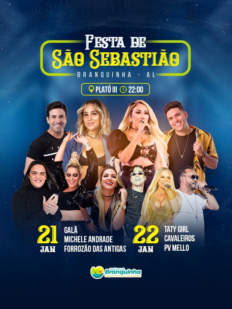Nos dias 21 e 22, a prefeitura preparou uma programação artística, que levará muita música e animação aos branquinhenses e visitantes. No sábado (21), a festa fica a cargo de Michele Andrade, Galã e Forrozão das Antigas; já no domingo (22), a alegria toma conta do Platô III ao som de Taty Girl, Cavaleiros e PV Mello.