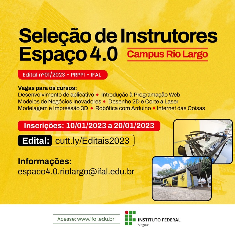O Instituto Federal de Alagoas (Ifal) publicou, nesta terça-feira (10), o edital de Seleção de Instrutores para o Espaço 4.0 do Campus Rio Largo. As inscrições acontecem até o dia 20 de janeiro, por meio de preenchimento de formulário eletrônico.