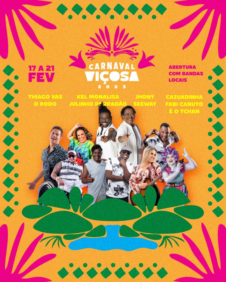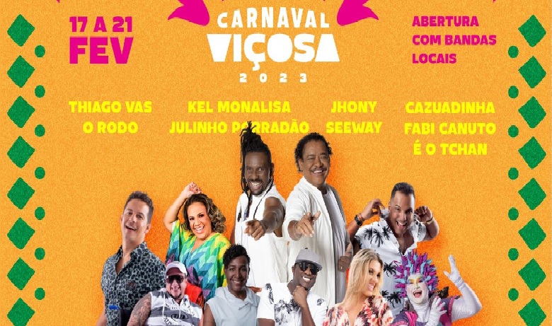 - Na terça-feira (21), a festa começa mais cedo, a partir das 16 horas, com a matinê que será animada pela banda Cazuadinha, seguida por Fabi Canuto. O Carnaval 2023, em Viçosa, será encerrado com o show da grande atração: É o Tchan.