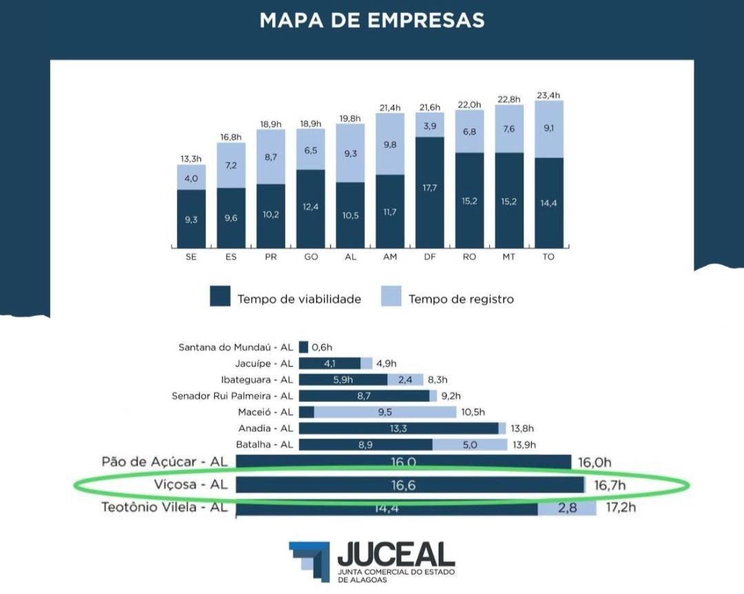 Entre todos os 102 municípios alagoanos, Viçosa tem o 9º menor tempo de registro empresarial do estado. Enquanto que o prazo médio para registro de negócios em Alagoas é de 19,8h, o que deixou o Estado em 5º lugar no país e em 2º no Nordeste, em Viçosa é ainda menor: 16,7h. O município também está na lista dos que mais abriram novas empresas em 2022, em ranking divulgado pela Junta Comercial do Estado de Alagoas (Juceal).