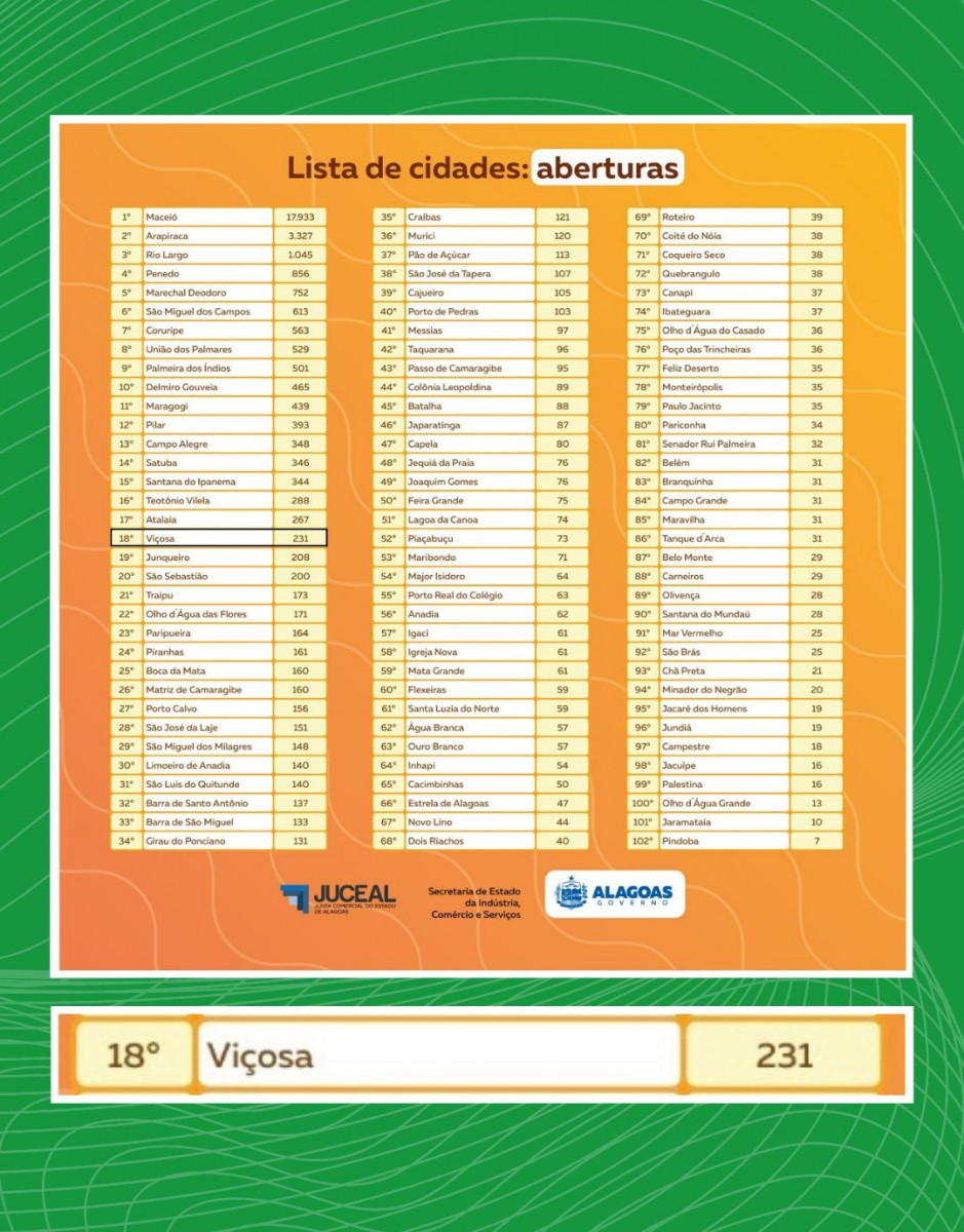 A Juceal publicou, na sexta-feira (27), o ranking de abertura de empresas em 2022 com base nos 102 municípios alagoanos. E Viçosa foi o 18º que mais abriu novos negócios: 231 no total.