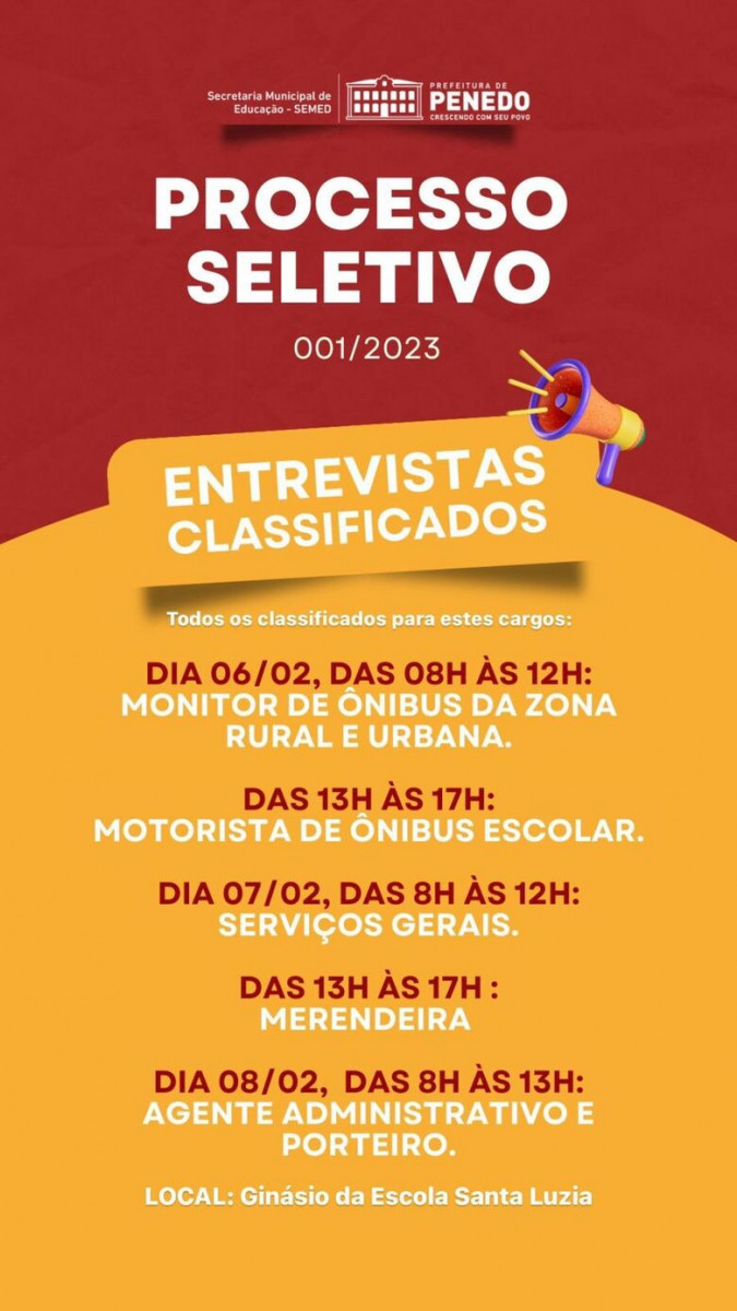 O Processo Seletivo Simplificado (PSS) 2023 realizado pela Secretaria Municipal de Educação (Semed) da Prefeitura de Penedo avança para a fase de entrevista com os classificados.