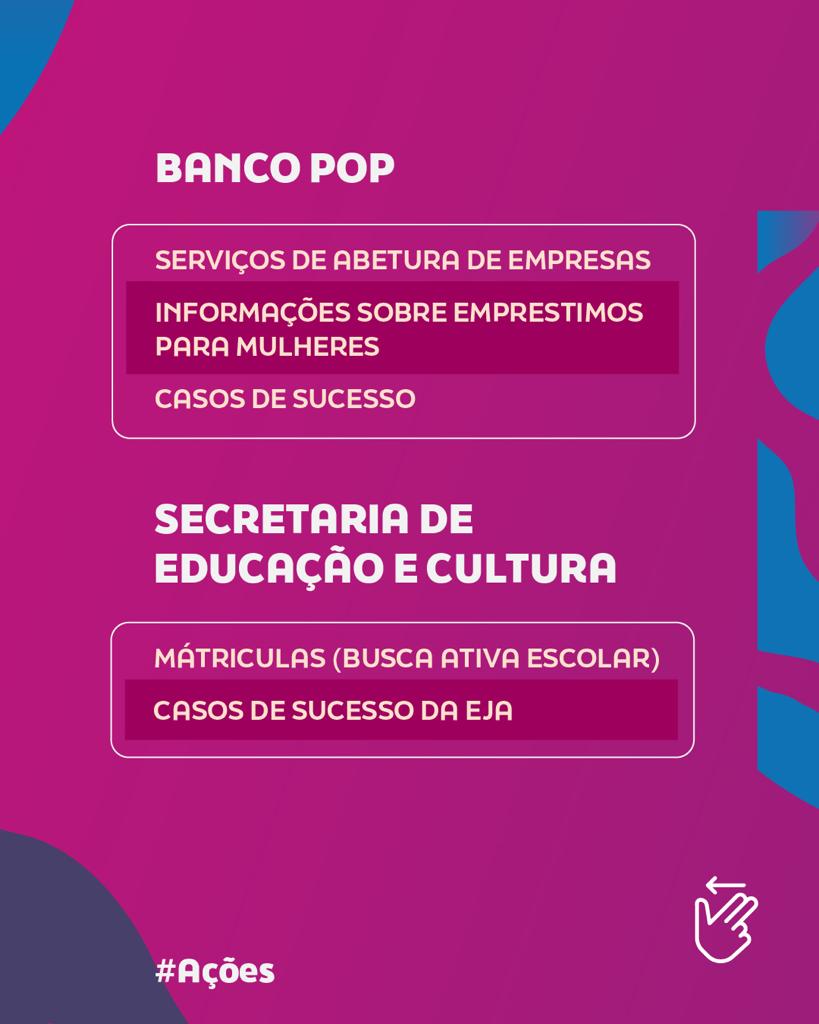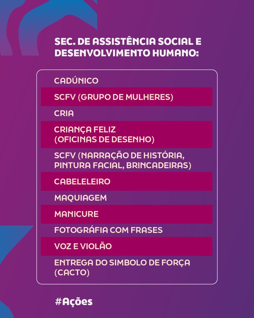 Na Avenida do Futuro, uma grande estrutura está sendo montada para concentrar os serviços ofertados pelas equipes de cinco secretarias, da Saúde à Assistência Social. Vai ter vacinação e exame odontológico, orientações sobre como empreender e espaço exclusivo para a garotada. Tudo com foco no empoderamento feminino, como explica a vice-prefeita de Pilar, Ivanilda Rodrigues.