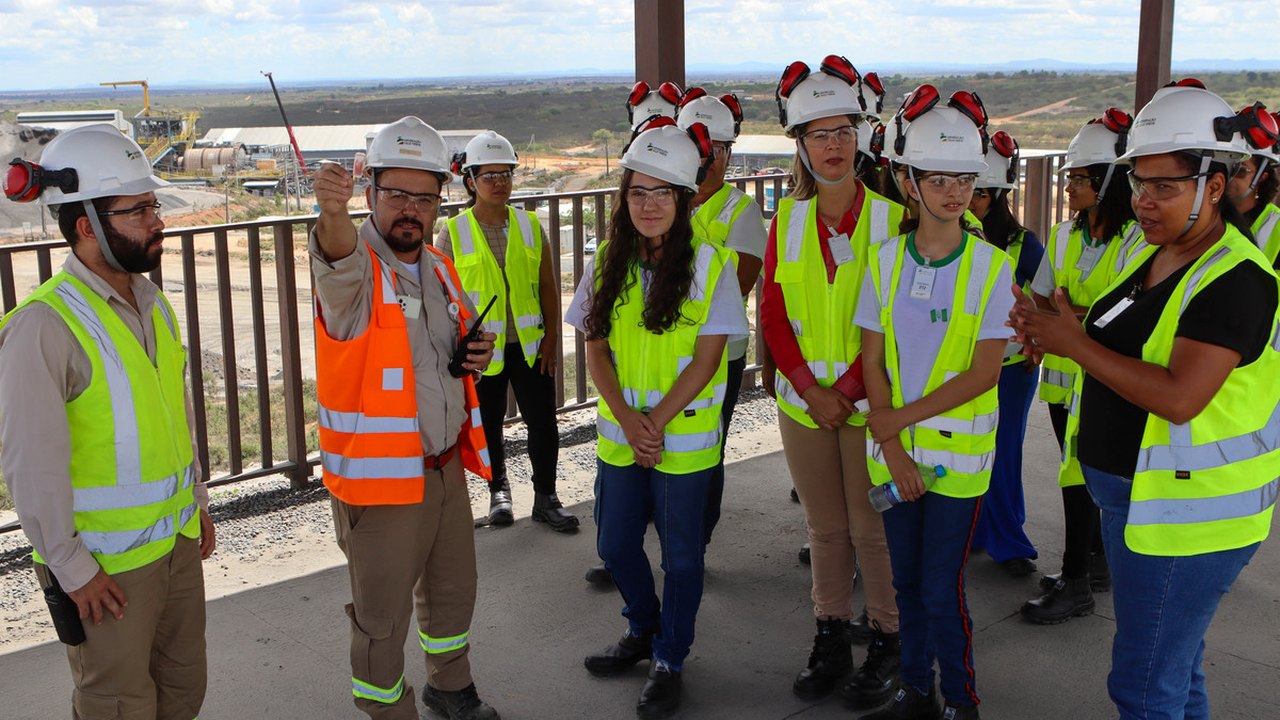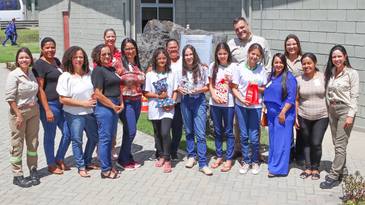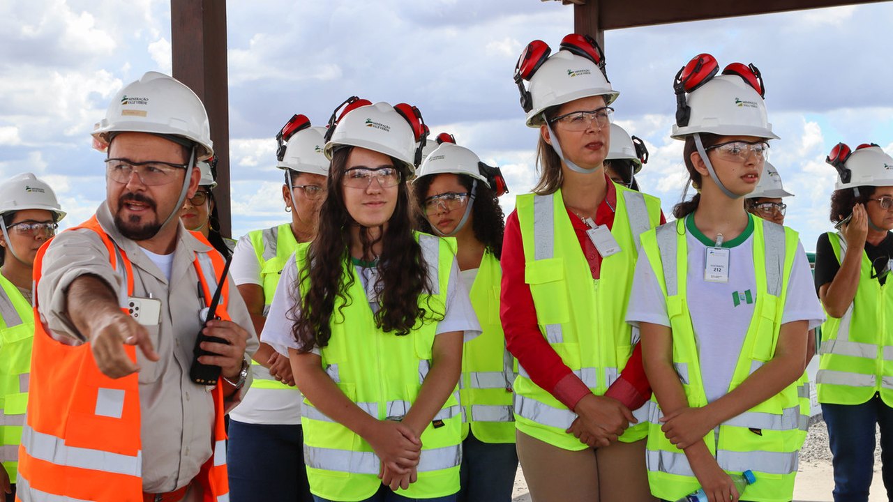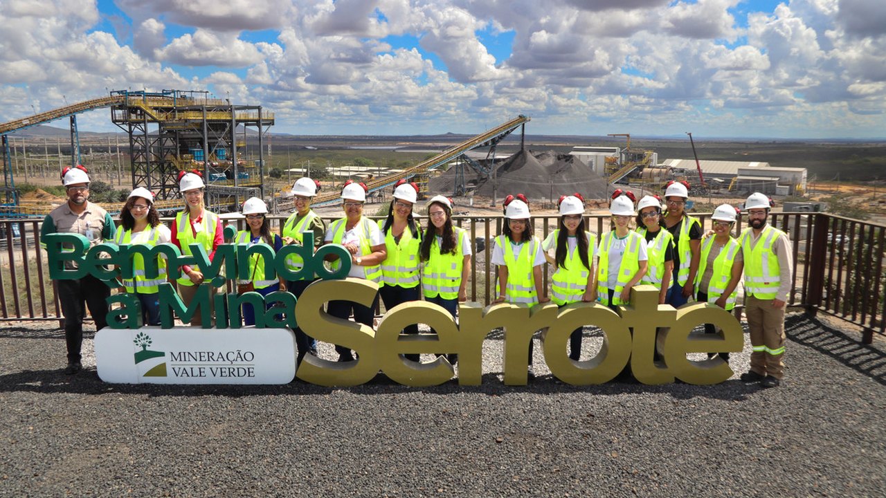 Depois de premiadas, acompanhadas das gestoras e professoras da escola, elas conheceram de perto a MVV, indo até o totem instagramável no platô da Britagem, com uma vista panorâmica da Mina Serrote.
