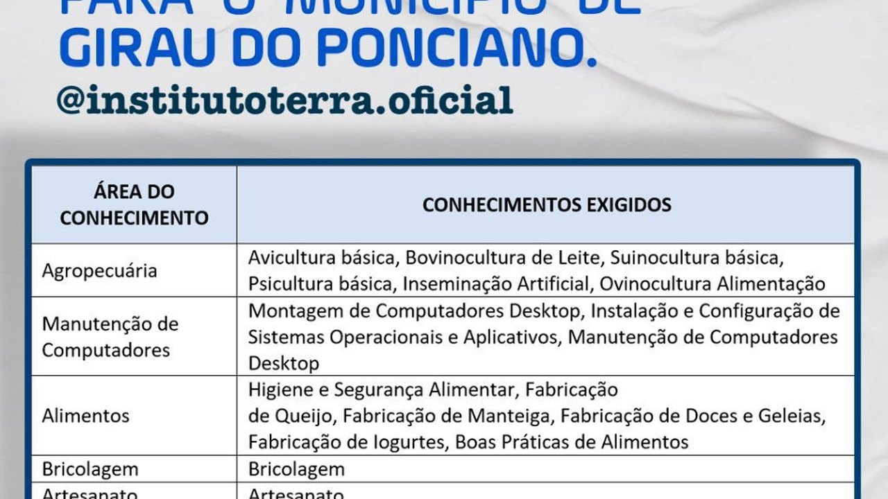 Instituto Terra oferta 60 vagas para instrutor de cursos profissionalizantes em Girau do Ponciano