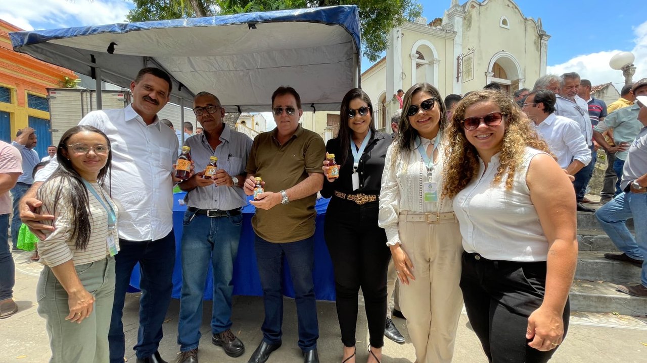 O prefeito de Viçosa, João Victor, o superintendente do Conagreste, Júnior Mota, as veterinárias do Consórcio, Camila Silva e Taine Soares, acompanharam a solenidade de entrega do selo SIM/Conagreste, na presença de políticos, autoridades municipais de Viçosa e da população presente.