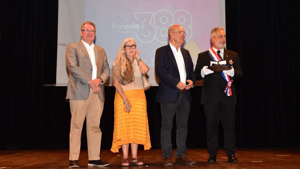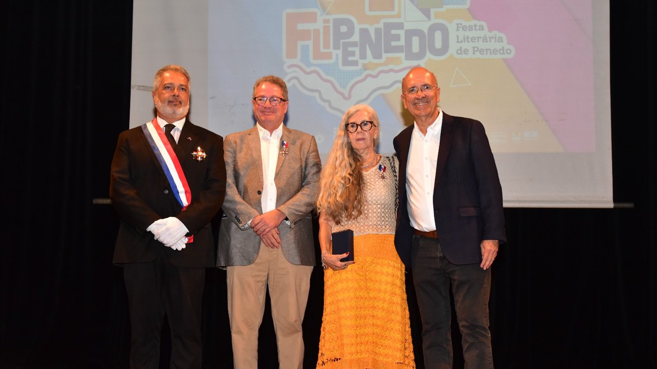 No encerramento da FliPenedo 2024, o Prefeito Ronaldo Lopes concedeu ao jornalista e escritor Maurício Melo Júnior – curador das três edições do festival literário – e à psiquiatra Maria da Graça Ivo – filha do poeta Lêdo Ivo, um dos homenageados do evento – a maior honraria do município, a Comenda Barão de Penedo.