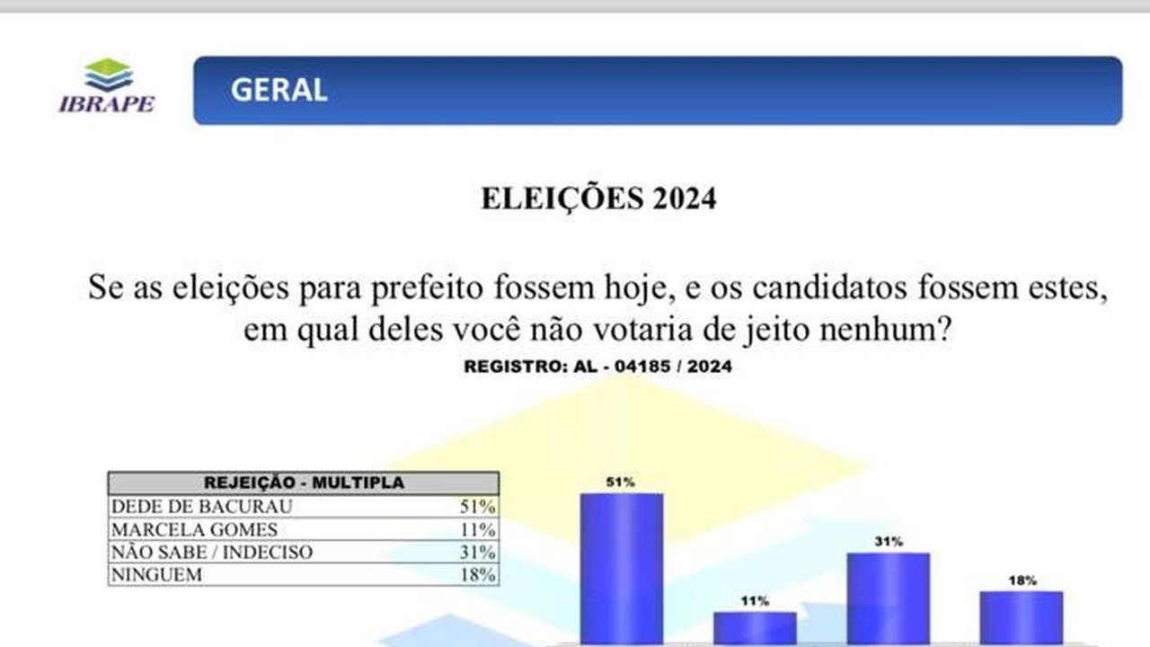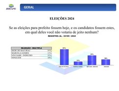 A pesquisa Ibrape tem intervalo de confiança de 95% e margem de erro de 3,57% pontos percentuais para mais ou para menos. Foram entrevistadas 700 pessoas com idade acima de 16 anos nas áreas urbana e rural. O número do registro é AL-04185/2024.