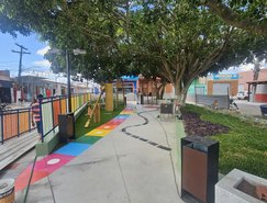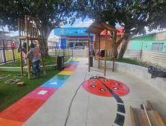 O espaço recebeu playground, pintura artística, escorregadores, gangorras, bancos, paisagismo, piso tátil, piso em concreto polido e iluminação de LED.