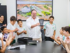 No encerramento da visita, as professoras e o aluno Talysson Santana entregaram dois presentes ao prefeito Luciano Barbosa em nome da escola.