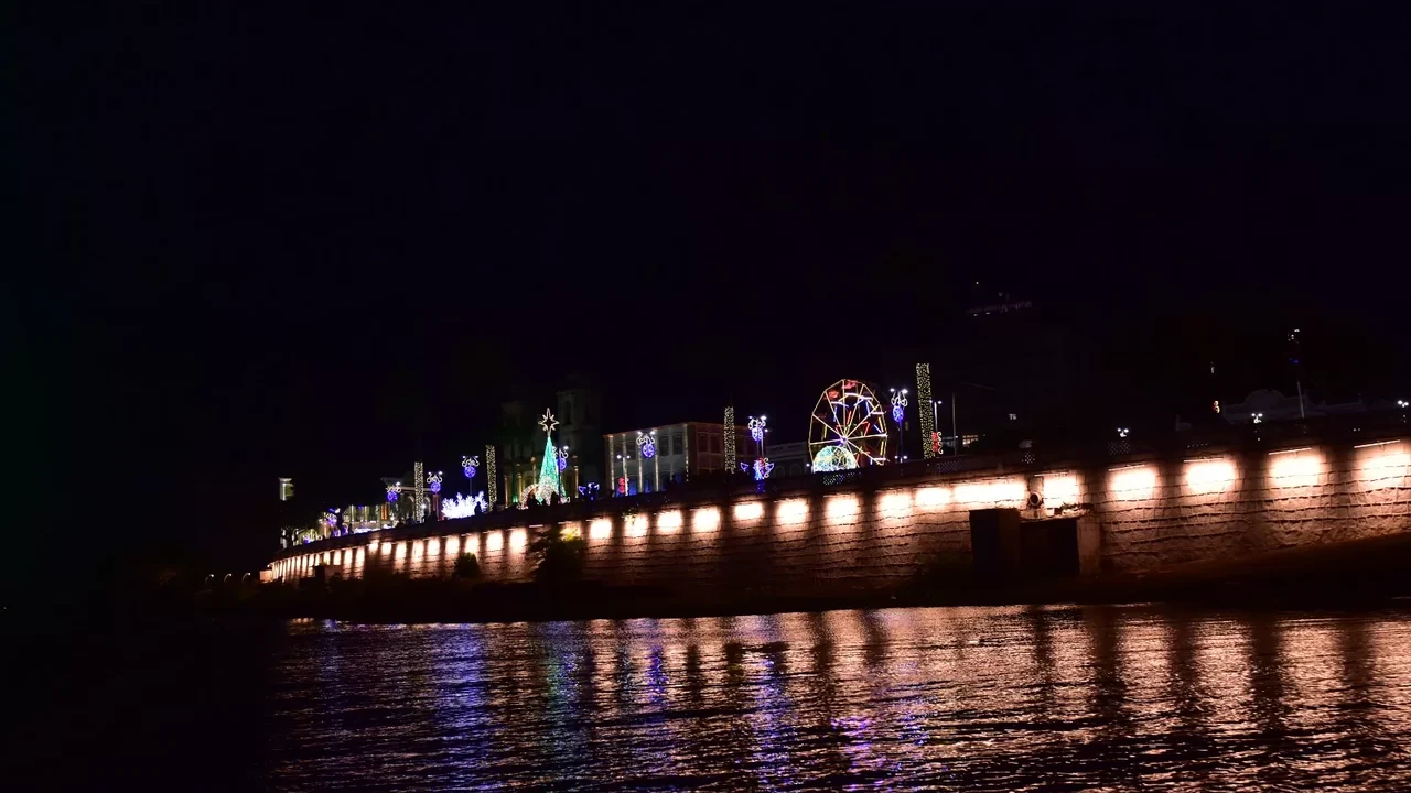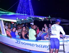 Ao mesmo tempo em que curtem o passeio no barco decorado, iluminado e com várias músicas natalinas, o público aprecia, de um ângulo privilegiado e ainda mais especial, a nova iluminação da Rocheira e a decoração de Natal da cidade que está mais colorida e conta com novas cores e novos elementos.