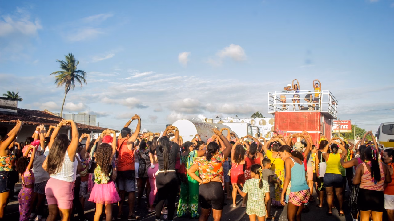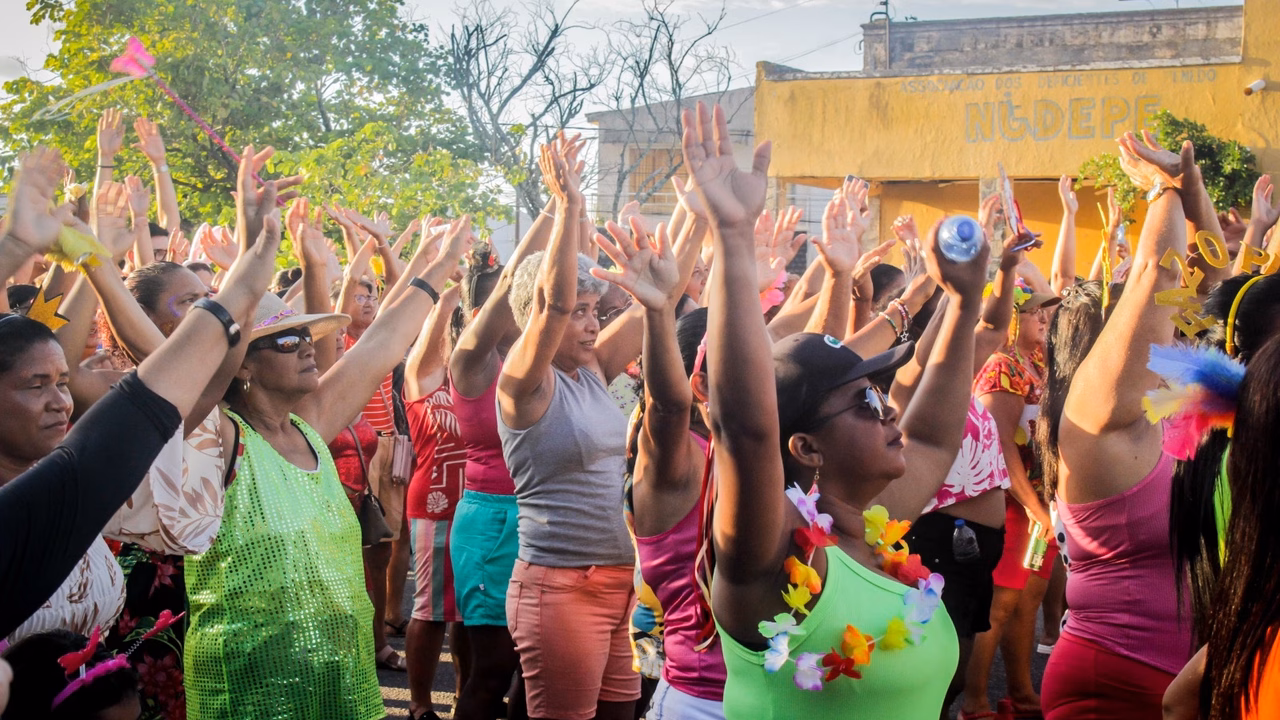 Depois do aquecimento, o DJ botou a trilha carnavalesca pra tocar. Em cima do minitrio, a coreografia era comandada por quem está no dia a dia das pessoas assistidas nos CRAS, com aulas de dança que combatem o sedentarismo, ajudando assim na prevenção e no tratamento de problemas de saúde.