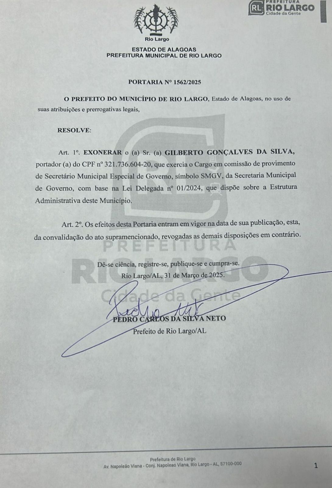 Em meio à maior turbulência política vivida recentemente por Rio Largo, o prefeito Pedro Carlos da Silva Neto, conhecido como Carlos (PP), exonerou nesta segunda-feira (31) o ex-prefeito Gilberto Gonçalves do cargo de secretário municipal. A decisão veio logo após a tentativa frustrada de afastamento do chefe do Executivo por meio de uma suposta carta de renúncia, considerada falsa e repudiada pelo próprio Carlos.