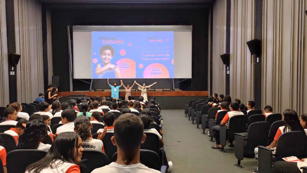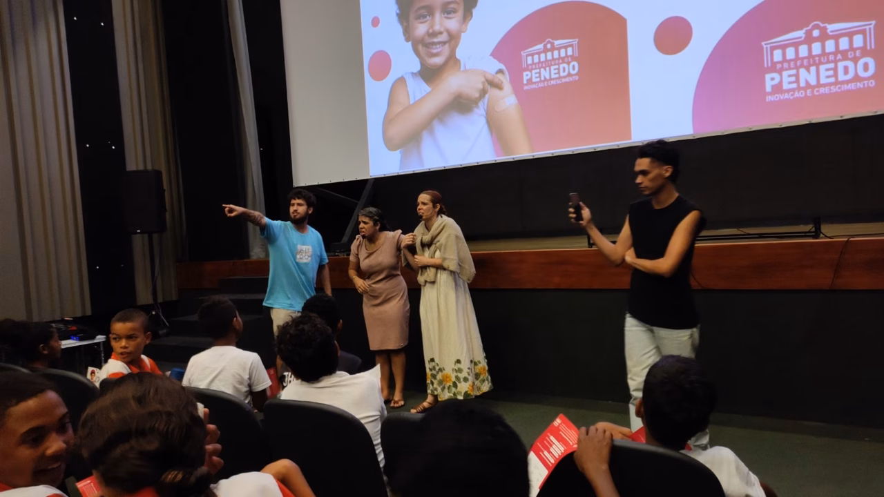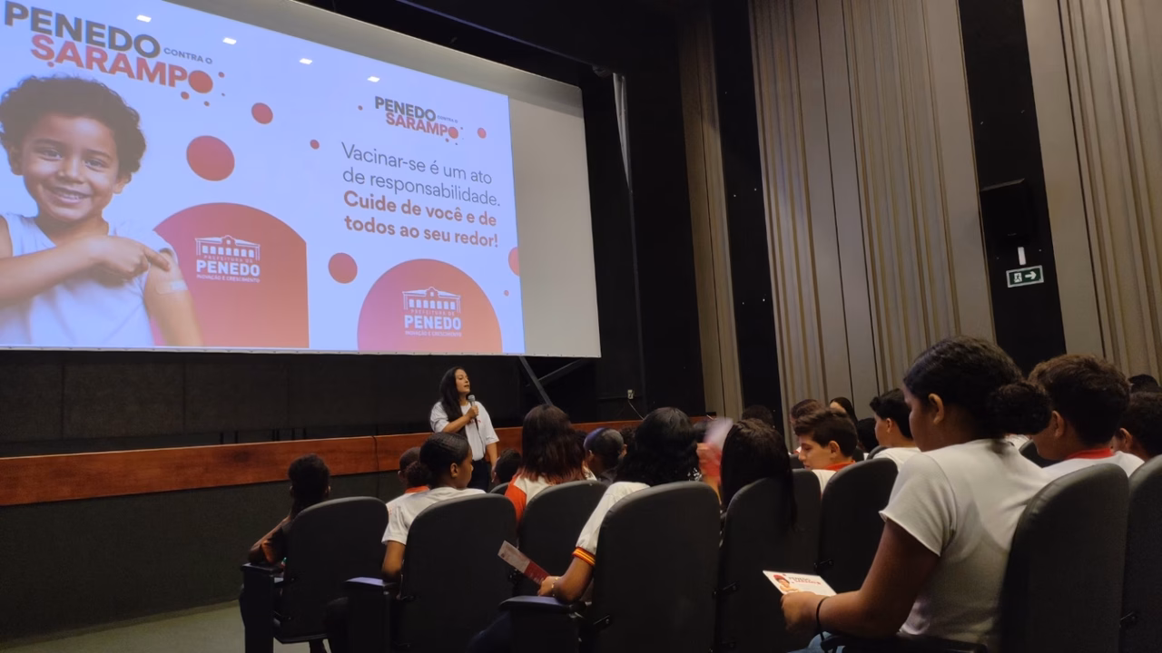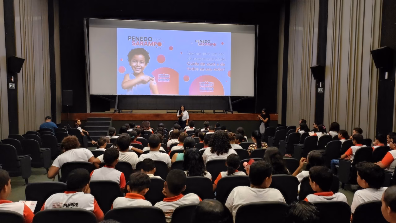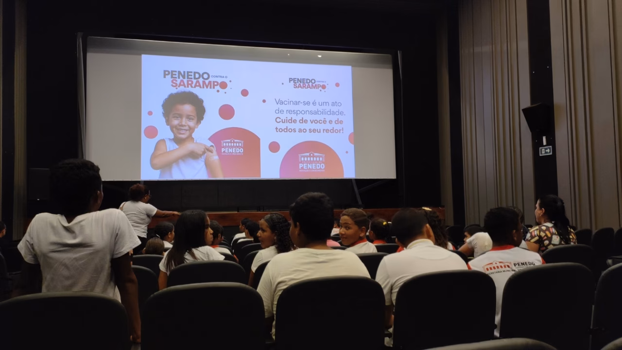 O trabalho conjunto levou estudantes da rede pública municipal até o Cine Penedo nesta quinta-feira, 23, onde a Secretaria Municipal de Saúde (SMS) distribuiu panfletos, exibiu vídeos educativos sobre a importância da vacinação e promoveu uma apresentação teatral para informar alunos e alunas sobre os sintomas e casos graves de doença.