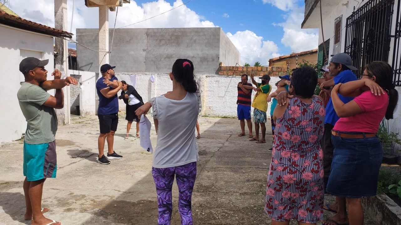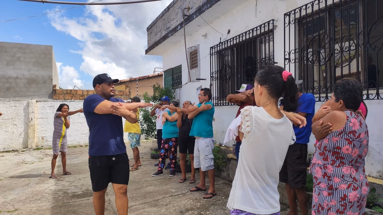Os usuários da unidade vinculada à Secretaria Municipal de Saúde (SMS) participaram de uma atividade física comandada pelo educador físico Adriano Ramalho. Eles alongaram e fizeram atividades para fortalecer o corpo. O exercício regular reduz a ansiedade e estresse, além de estimular a liberação de endorfinas, que contribuem para a sensação de prazer e redução da dor, além de melhorar a autoestima e a função social.