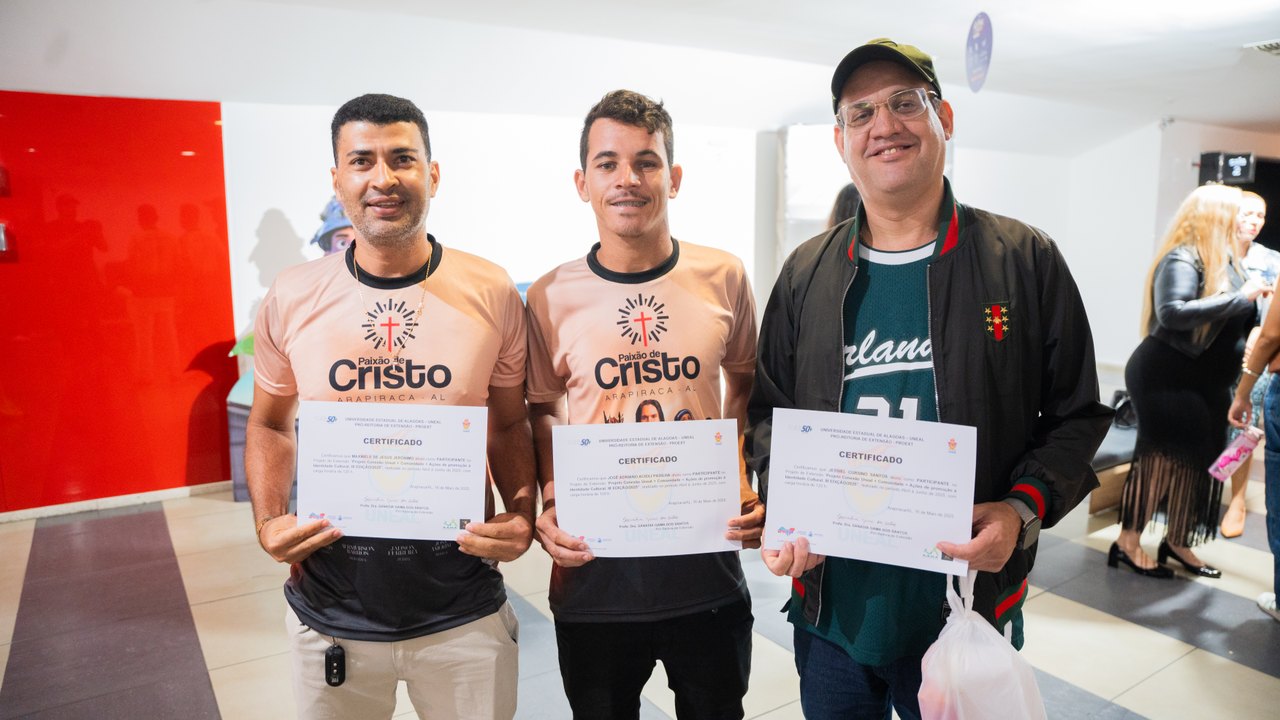Ainda na exibição, os participantes da Paixão que faziam parte do Projeto de Extensão Conexão Uneal + Comunidade = ações de promoção à identidade cultural receberam os certificados de conclusão do projeto.