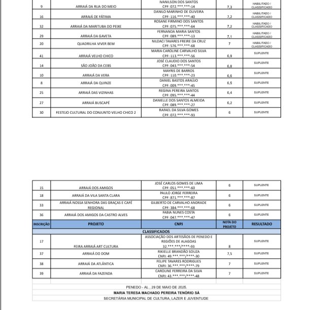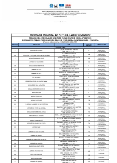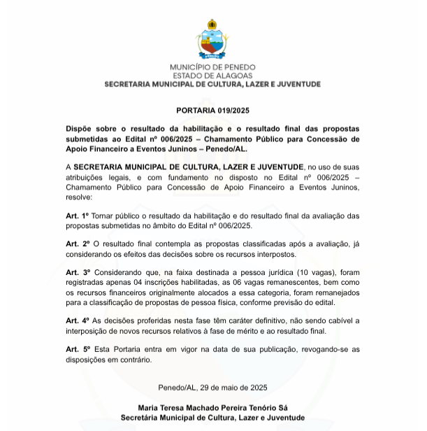 A Secretaria Municipal de Cultura, Lazer e Juventude (SEMCLEJ) divulga nesta quinta-feira, 29 o resultado final do Edital nº 006/2025, referente ao Chamamento Público para Concessão de Apoio Financeiro a Eventos Juninos.