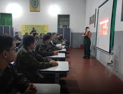 A capacitação foi aberta com a parte teórica sobre emergências médicas, incluindo técnicas de avaliação do paciente, tratamento de ferimentos e reanimação, assim como instruções sobre higiene pessoal voltada para situações militares.