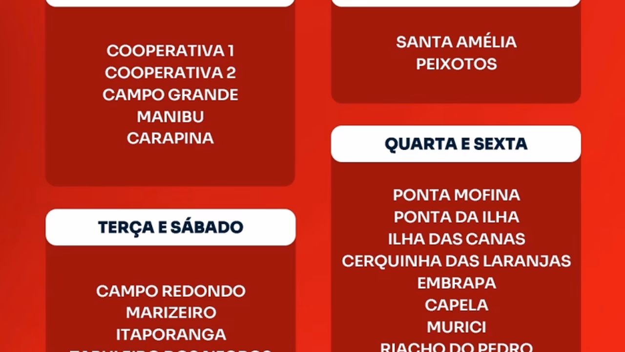 Já na zona rural, a programação foi organizada para atender as particularidades de cada região, com dias fixos de coleta conforme a localidade. Povoados como Ponta Mofina, Santa Amélia, Peixotos, Campo Grande, Marizeiro, Ilha das Canas, entre outros, passam a contar com dias certos de atendimento, evitando acúmulo de resíduos e melhorando a logística de deslocamento dos caminhões.