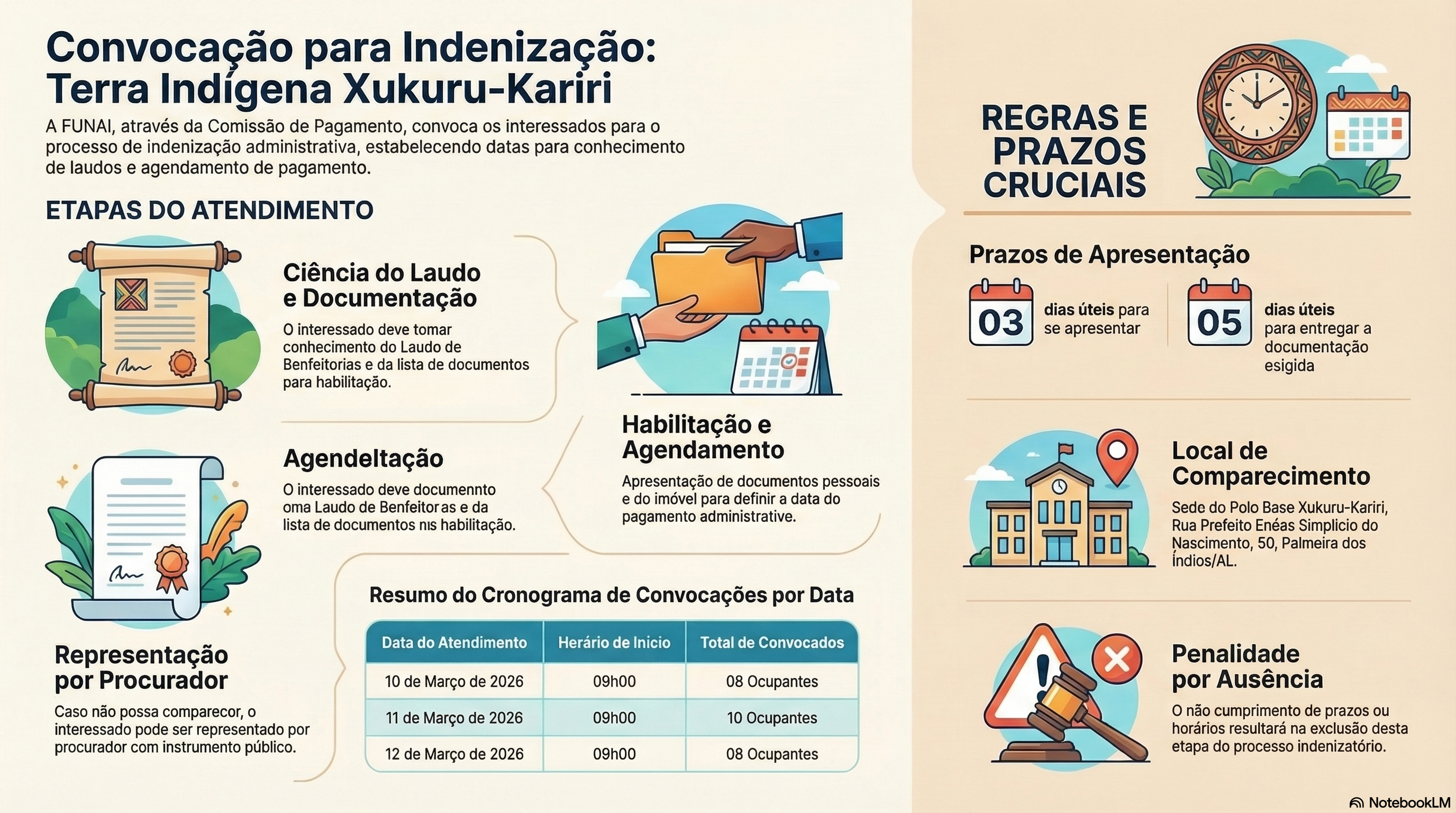 Os convocados deverão comparecer à Sede do Polo Base Xukuru-Kariri, situada na Rua Prefeito Enéas Simplício do Nascimento, nº 50, bairro São Cristóvão, em Palmeira dos Índios. Segundo a Funai, o comparecimento tem três finalidades centrais: tomar conhecimento do Laudo de Benfeitorias (LB) referente ao imóvel de interesse, receber orientação sobre a documentação necessária para habilitação e agendar a data do pagamento da indenização.